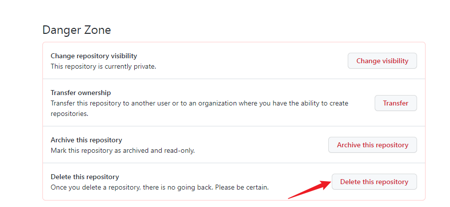 解决方法②:把上文中仓库365E5删除后重新再来一遍第三节的流程,直到运行成功为止。删库方法:切换到setting选项,拉到最下面,点击“Delete this repository”。