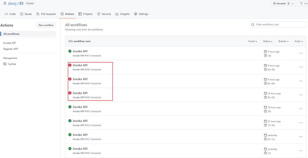解决方法④:在365E5/.github/workflows/下的两个文件:register.yml、routine.yml。编辑一下这两个文件。只需在开头加一个注释,以#开头即可。保存后,再试试,有时也会成功~